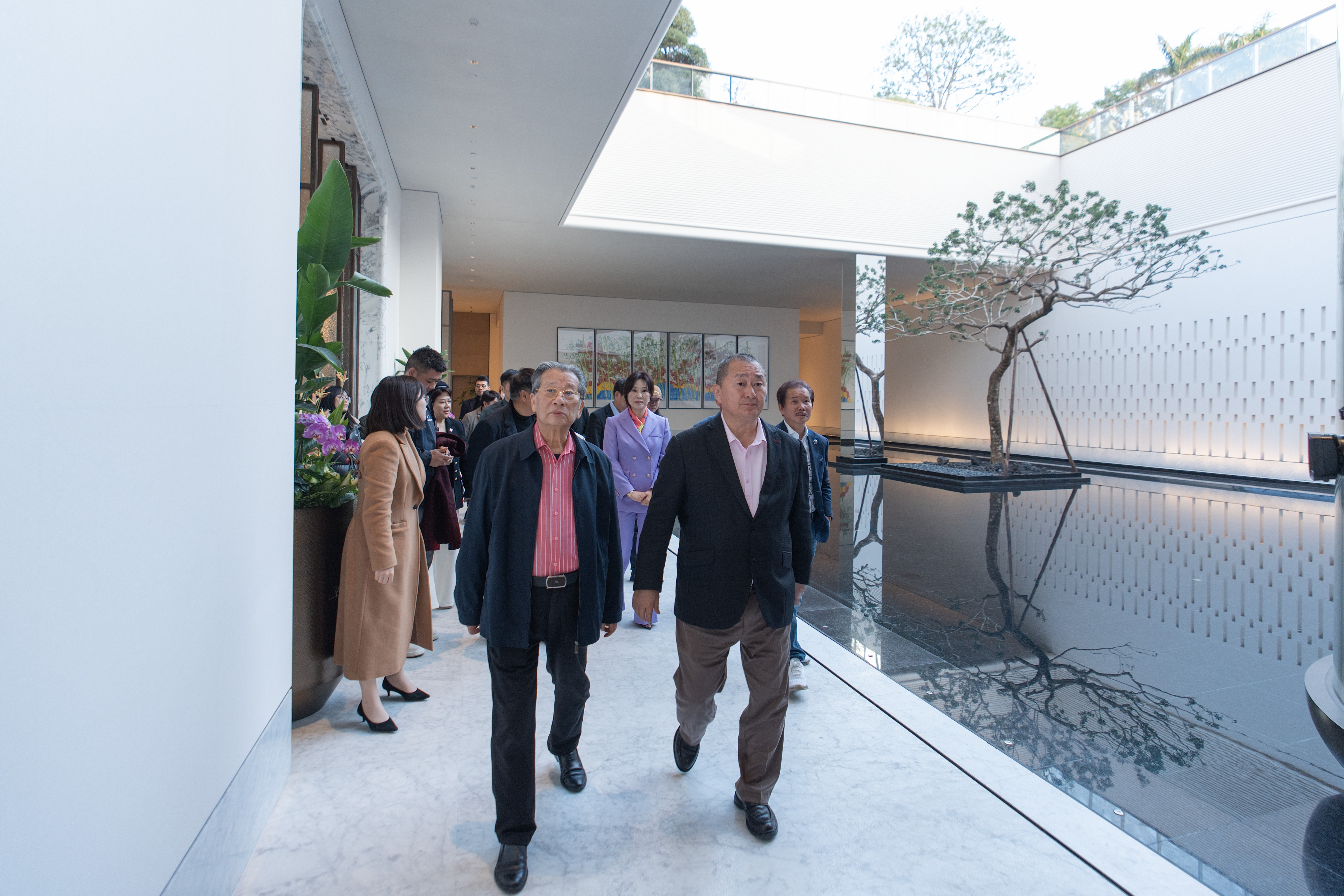 活动现场,许钦松、方楚雄与郭莽园、许固令、许鸿飞等20多名艺术家以及香江书画艺术馆馆长、未来生活研究院院长翟美卿一起参观了张大墨艺术展、袁熙坤“艺术照见未来”艺术展,以及香江1号名车博物馆。