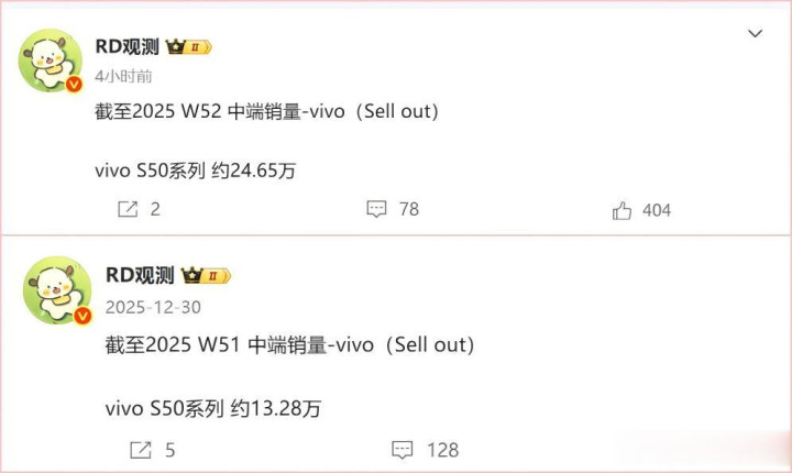 vivo S50系列12月19日开卖,首周(W51)销量为13.28万台,截至W52总销量为24.65万台,W25单周销量也约为10万台,单纯对比首周的销量,S50系列7天的销量落后于nova15系列4天的销量。