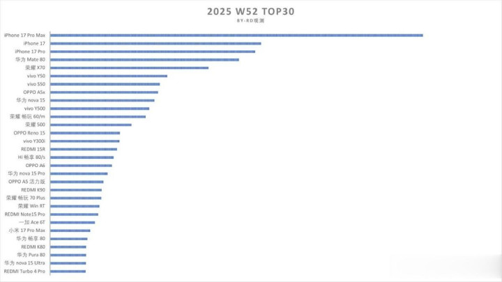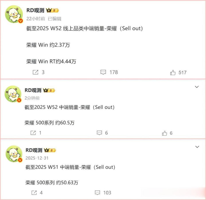 我们再对比一下荣耀的中端,荣耀WIN系列12月26日开售,W52周3天卖出6.81万台,平均每天销量仅为2万多一点,明显不如华为nova15系列。我们再对比一下荣耀500系列,11月27日上市,截至W52总销量为60.5万台,W52单周销量也约为10万台。