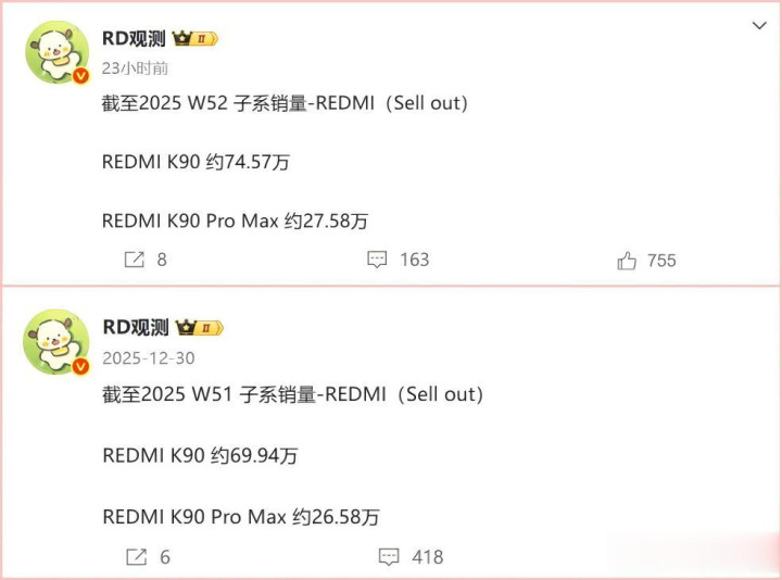 小米主品牌的civi系列太拉胯了,我们就不对比了,直接对比红米K90系列,10月23日开售,截至W52上市超2个月,总销量约为102万,W52单周销量不足6万台。红米K系列一直是小米中端的销量担当,没想到K90系列这么拉胯。