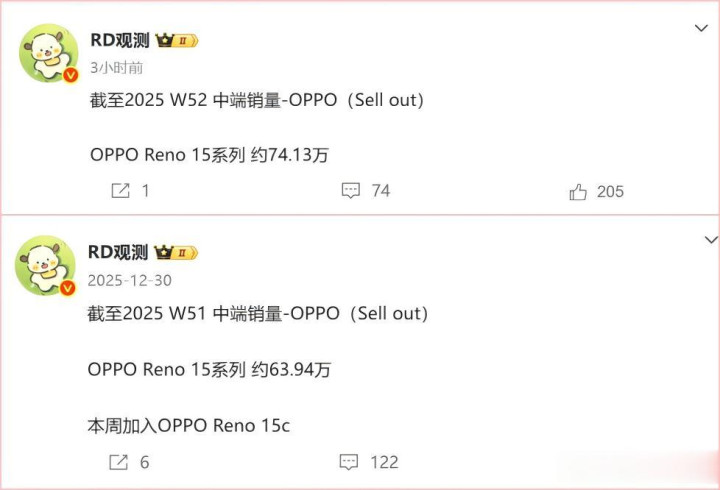 OPPO Reno15系列11月21日上市,截至W52,总销量约为74.13万台,近一周的销量约为10万台,这还是在新机Reno15C加入的情况下完成的销量,要是没有15c的,周销量可能不足10万。